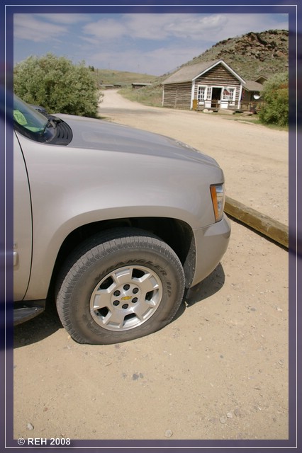 Wir steigen aus. Flat Tire. Das erste mal in sieben Nordamerikaurlauben. Wie gut, dass ich Ersatzreifen und Werkzeug kontrolliert habe!